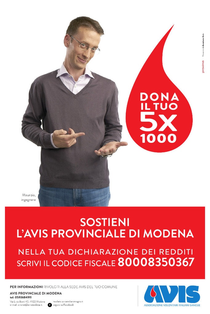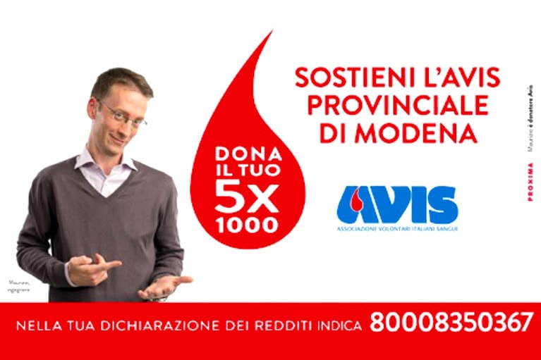 - Nel periodo estivo occorre una campagna promozionale mirata ad incrementare le donazioni di sangue per far fronte al fabbisogno della provincia di Modena e del resto dell’Italia. Ogni anno per tale campagna l’Avis spende oltre 15.000 euro. Impossibile senza 5 per mille.