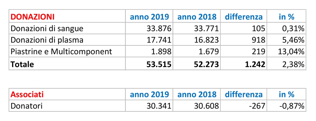 Sul versante delle donazioni il risultato complessivo della raccolta è di 53.515 unità contro le 52.273 del 2018, 1.242 in più pari al 2, 38 %, dato che rientra pienamente, anzi supera, gli obiettivi previsti dalla programmazione regionale per lo scorso anno.
