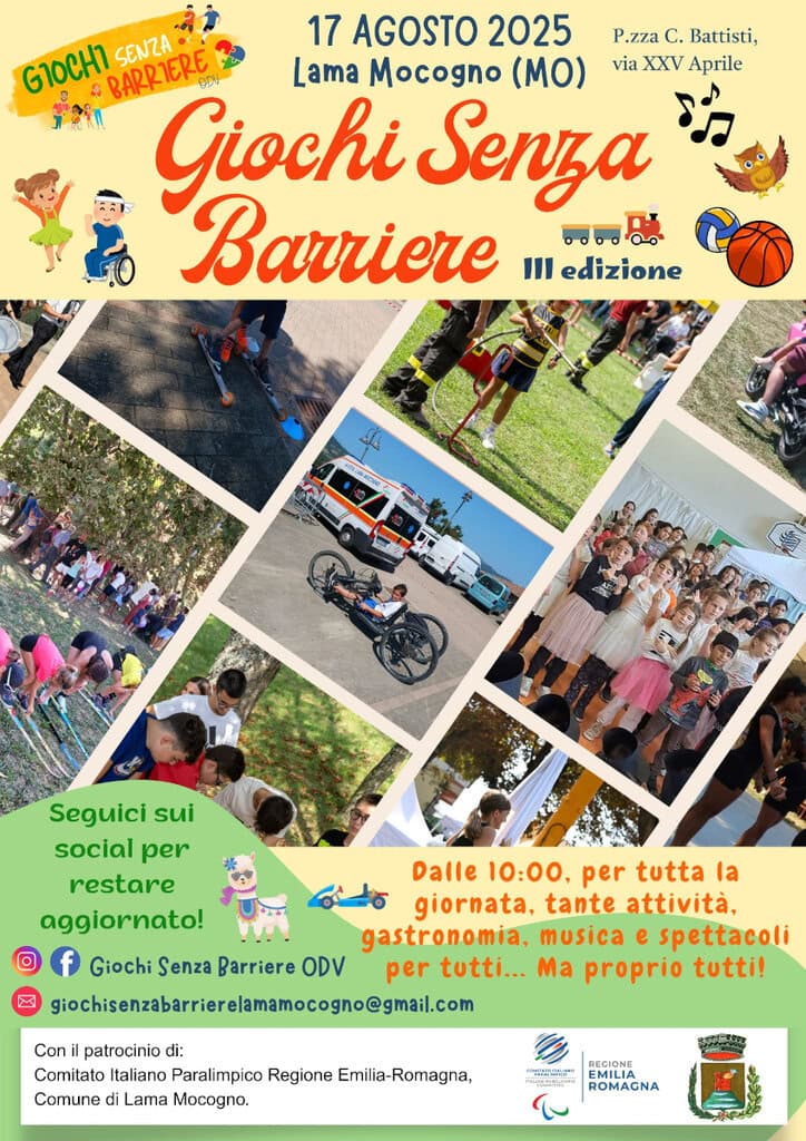 Sarà una grande festa di inclusione e solidarietà quella che si terrà domenica 17 agosto a Lama Mocogno con la terza edizione di “Giochi senza barriere”, una intera giornata che unisce le associazioni di volontariato del territorio per sostenere progetti a favore della disabilità. Dalle 10 in Piazza Battisti per tutto il giorno si alterneranno attività sportive, gastronomia, musica e spettacolo accessibili a tutti, ma proprio a tutti! Non poteva mancare l’Avis di Lama con i suoi attivissimi volontari che dalla loro variopinta postazione intratterranno adulti e bambini con giochi, gadget e tutte le informazioni sul dono del sangue.