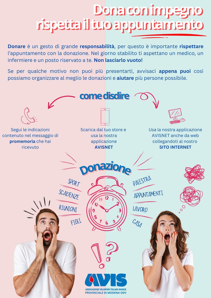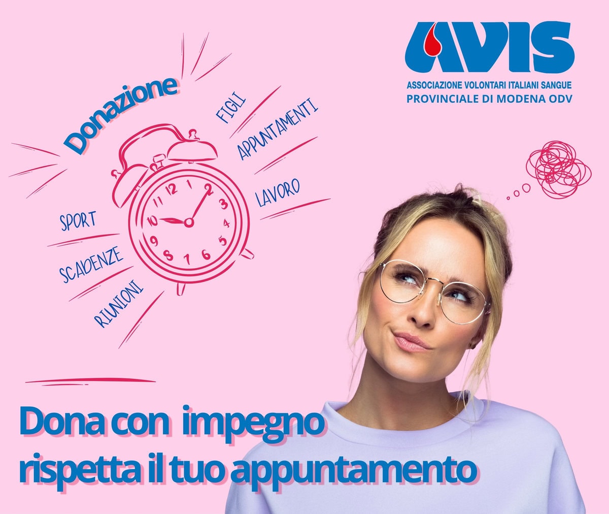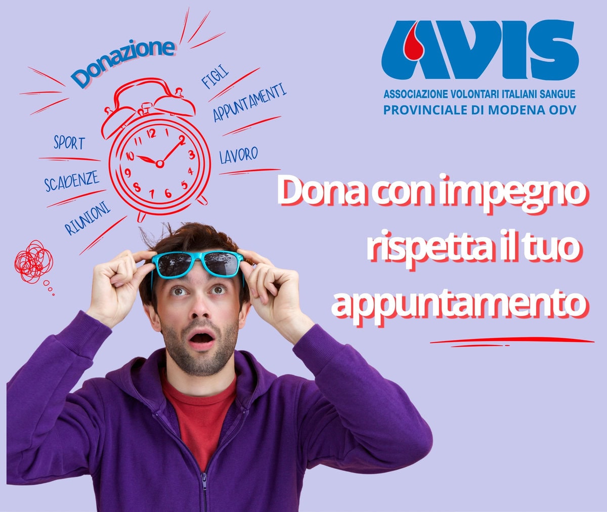 Per questo la nostra Avis lancia la campagna “Dona con impegno, rispetta il tuo appuntamento” per sensibilizzare tutti i donatori sull’importanza di tener fede alla “promessa” fatta quando si fissa una donazione. Sarà un messaggio semplice e chiaro che fa appello al senso di responsabilità di chi ha scelto di donare: lo troveremo diffuso sui media, sui social, nelle sedi di prelievo ma anche come promemoria diretto a ciascun donatore prenotato.