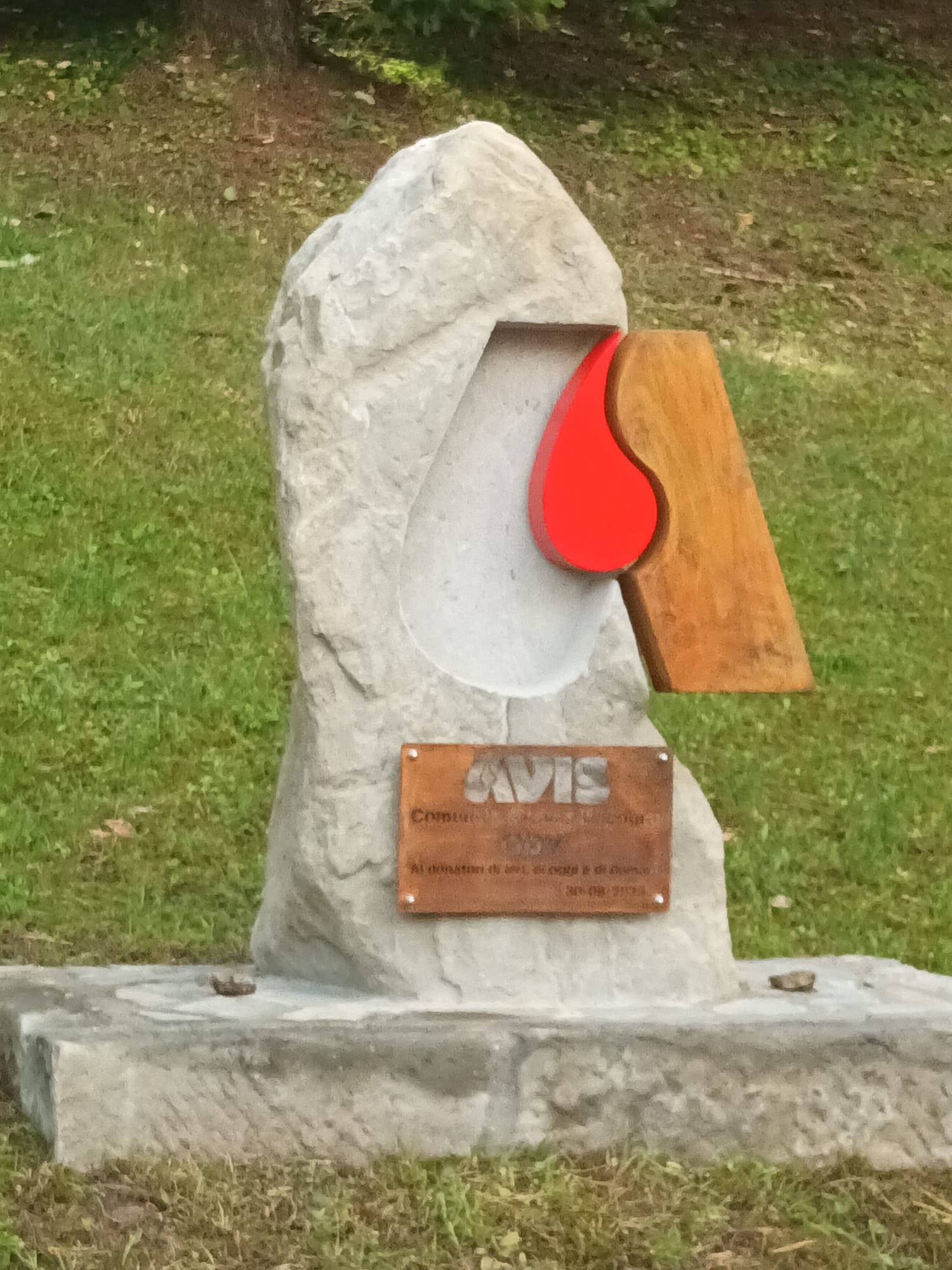 La pietra arenaria derivante da uno scavo delle nostre zone indica il radicamento con il territorio di Avis, la goccia in acciaio simboleggia la contemporaneità e il cuore pulsante dei donatori e l’ultima parte, che completa la lettera A di Avis, è in acciaio Corten, materiale di recente utilizzo, che rappresenta il futuro. Il tutto è posizionato su un basamento formato da gradini di pietra recuperati dalla vecchia scalinata monumentale di Lama, danneggiata dai bombardamenti della seconda guerra mondiale, memoria del nostro passato. Diciamo che non si potevano incarnare in modo migliore i valori della nostra associazione!