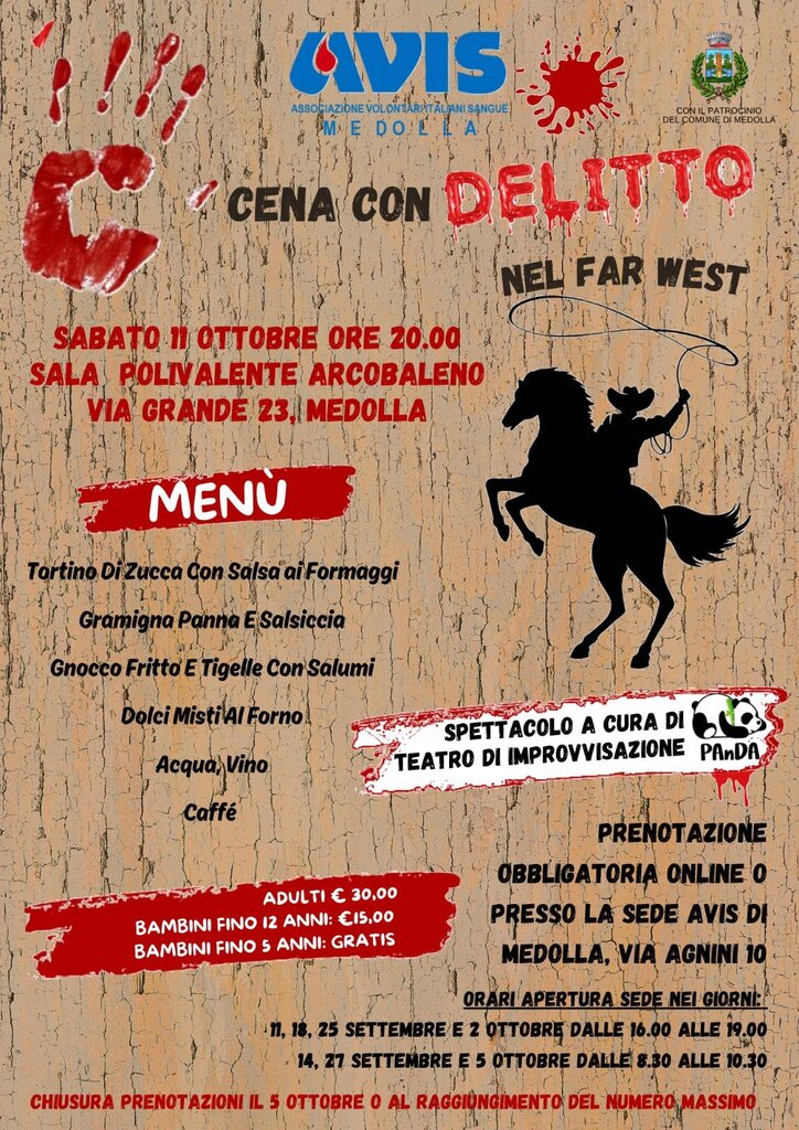 Sono già aperte le iscrizioni alla cena più horror che c’è, la Cena con Delitto che per la prima volta verrà organizzata dall’Avis di Medolla per sabato 11 ottobre e sarà ambientata…nel Far West.