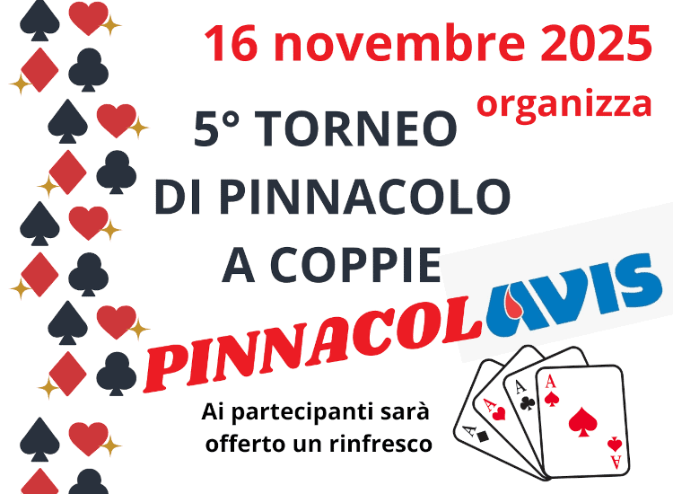 Edizione n. 5 per il PinnacolAvis, torneo a coppie di Avis Carpi in programma per domenica 16 novembre con inizio alle 15 al Centro Polivalente Giliberti di via Tassoni (ritrovo alle 14.30).