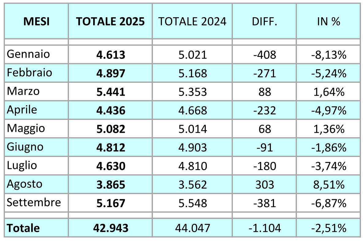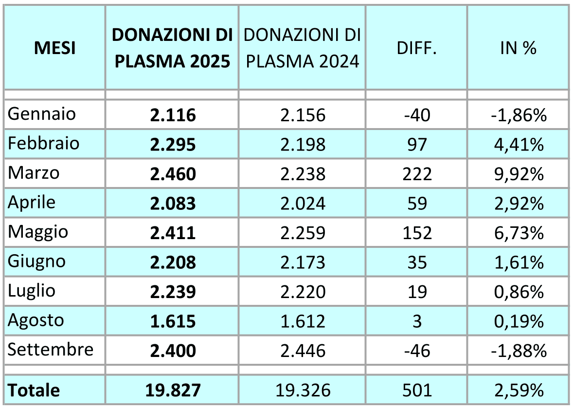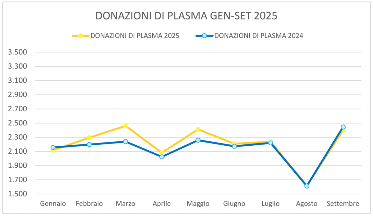 Il dato totale delle plasmaferesi conferma la sua positività con qualche flessione nei prelievi di Settembre. Complessivamente l’incremento è di 501 unità, un buon risultato pur riscontrando che anche questo tipo di donazione è in flessione dopo 7 mesi di crescita. Come detto l’aspettativa è riuscire a chiudere il 2025 con un incremento di almeno 700 unità, risultato raggiungibilissimo.