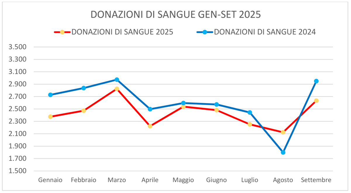Riassumendo, il totale delle donazioni nei tre trimestri del 2025 si colloca a quota 42.943 contro le 44.047 del 2024 con una flessione di 1.104 unità pari al 2,51%. Il risultato risente del prevedibile calo delle donazioni di sangue di settembre e della diminuzione anche delle plasmaferesi. A questo si aggiunge l’andamento ancora in discesa delle piastrine. Per potere rispondere con tranquillità alle richieste del nostro servizio trasfusionale, gli obiettivi da porsi con il contributo di tutti nell’ultimo trimestre sono un incremento delle donazioni di sangue, una ripresa in senso positivo di quelle di plasma e un recupero delle donazioni di piastrine.