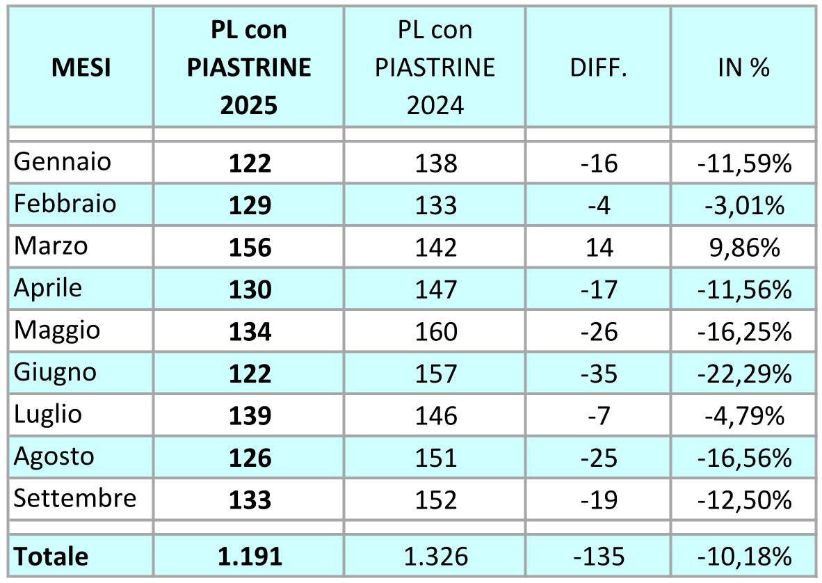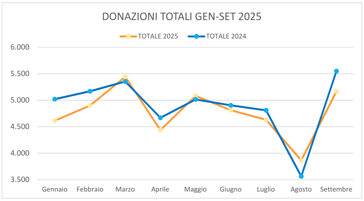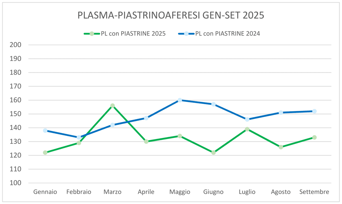 Il dato totale delle plasmaferesi conferma la sua positività con qualche flessione nei prelievi di Settembre. Complessivamente l’incremento è di 501 unità, un buon risultato pur riscontrando che anche questo tipo di donazione è in flessione dopo 7 mesi di crescita. Come detto l’aspettativa è riuscire a chiudere il 2025 con un incremento di almeno 700 unità, risultato raggiungibilissimo.