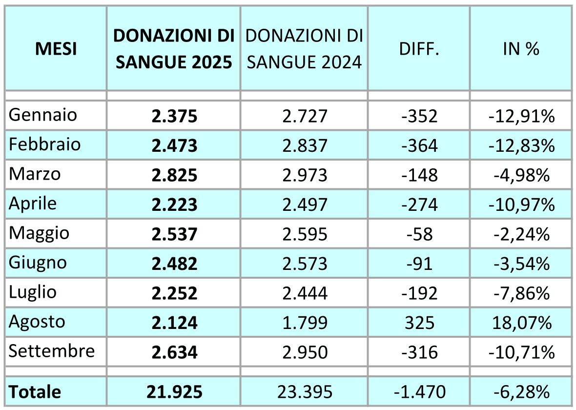Riassumendo, il totale delle donazioni nei tre trimestri del 2025 si colloca a quota 42.943 contro le 44.047 del 2024 con una flessione di 1.104 unità pari al 2,51%. Il risultato risente del prevedibile calo delle donazioni di sangue di settembre e della diminuzione anche delle plasmaferesi. A questo si aggiunge l’andamento ancora in discesa delle piastrine. Per potere rispondere con tranquillità alle richieste del nostro servizio trasfusionale, gli obiettivi da porsi con il contributo di tutti nell’ultimo trimestre sono un incremento delle donazioni di sangue, una ripresa in senso positivo di quelle di plasma e un recupero delle donazioni di piastrine.