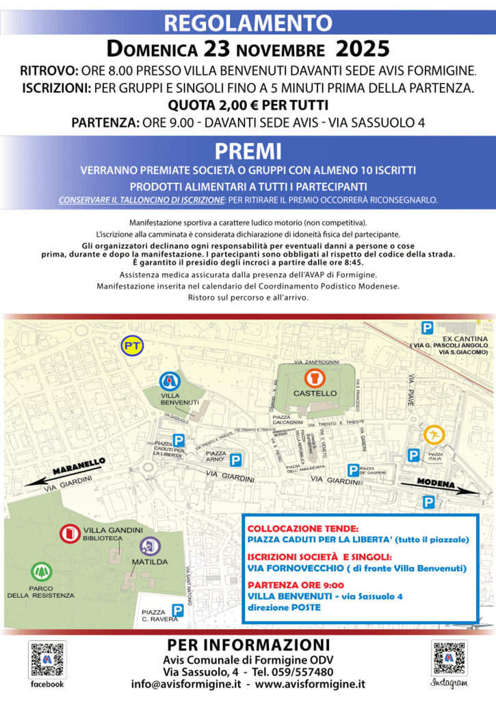 Fervono già i preparativi per la 14a edizione della CORRI CON L’AVIS, la ormai famosa e sempre partecipata camminata non competitiva su tre percorsi di 4, 8 e 13 chilometri a seconda del grado di preparazione e di agonismo dei partecipanti. Aperta a tutti, atleti, famiglie, grandi e piccoli, la partenza sarà domenica 23 novembre alle 9 (ritrovo ore 8) davanti alla nostra sede di Formigine in via Sassuolo. Le iscrizioni si raccolgono fino a cinque minuti prima del via, e al termine verranno premiate società o gruppi con almeno 10 iscritti, ma nessuno tornerà a casa a mani vuote: sono previsti infatti omaggi di prodotti alimentari per tutti i partecipanti. Chi volesse saperne di più su regolamento e percorsi può consultare il volantino in calce.