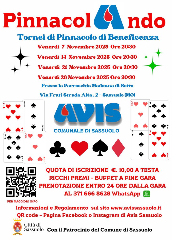 Per le iscrizioni si raccomanda di rivolgersi direttamente alla sede Avis di Sassuolo negli orari di apertura oppure contattare via whatsapp il numero 371 666 8626 entro le 24 ore antecedenti la sera del torneo.