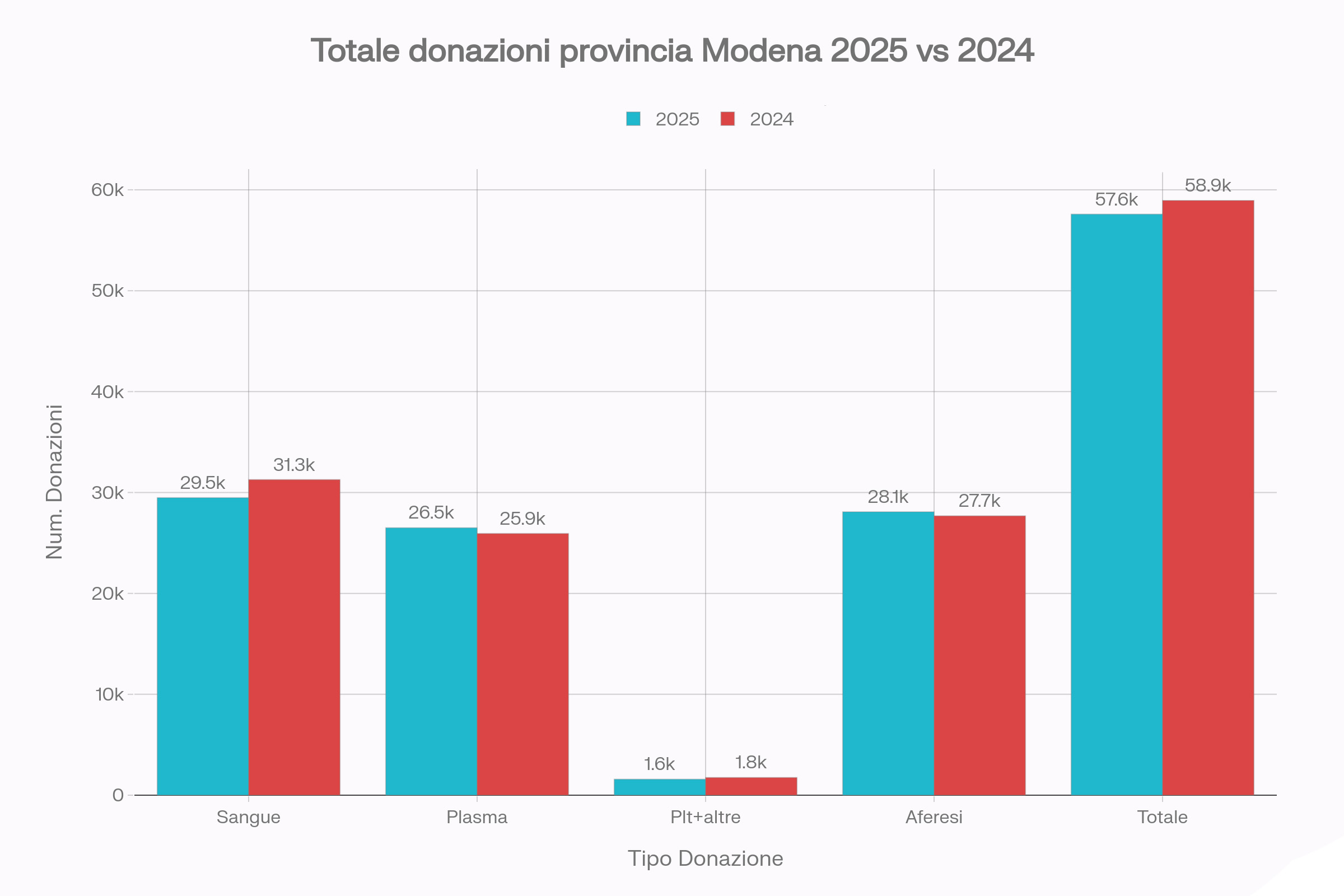 La flessione riguarda in particolare la raccolta di sangue intero, che nel 2025 ha raggiunto 29.489 donazioni, segnando una riduzione di 1.783 unità rispetto al 2024 (-5,7%).