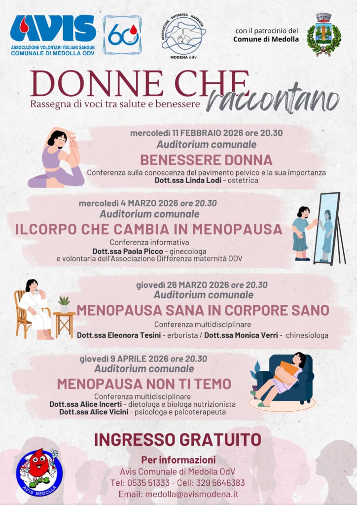 In parallelo al ciclo sanitario, è in fase di definizione anche una serie di incontri letterari al femminile in collaborazione con il Centro Culturale – Biblioteca Comunale di Medolla che potranno completare questo percorso tra salute, benessere e cultura mettendo in dialogo esperienze, storie, legami e fragilità raccontate da autrici locali.