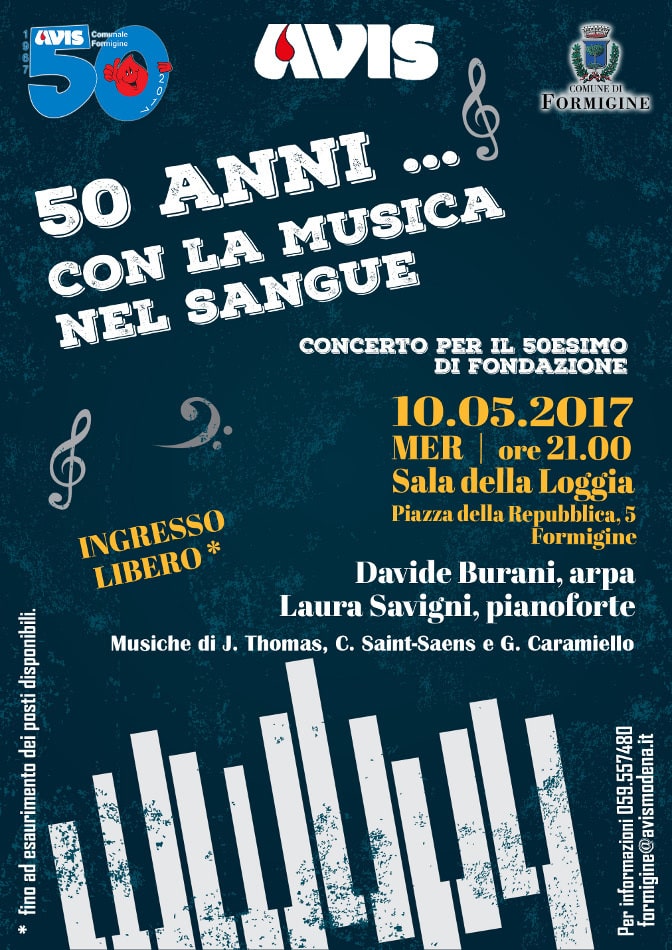L’arpa di Davde Burani e il pianoforte di Laura Savigni per festeggiare i 50 anni di Avis Formigine mercoledì 10 maggio, alle 21 presso la Sala della Loggia 3 a Formigine. Ingresso Libero.