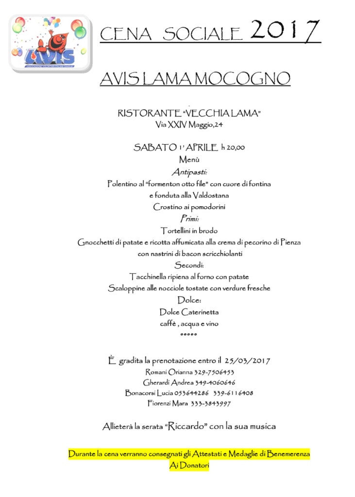 Avis Lama Mocogno organizza la cena sociale, con premiazione dei donatori, sabato 1° aprile dalle ore 20.00.