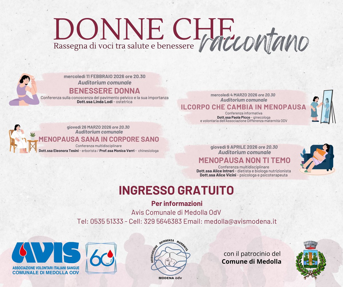 In partenza la rassegna “Donne che raccontano” 4 incontri dedicati alla salute e al benessere che confermano l’impegno costante di Avis Medolla sul territorio.