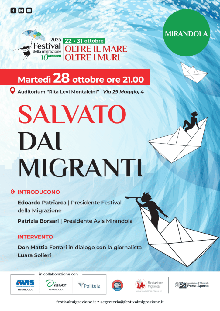 Particolarmente significativo l’appuntamento centrale del programma. Martedì 28 ottobre alle ore 21.00 presso l'”Auditorium R.L. Montalcini”, Don Mattia Ferrari presenterà il suo libro “Salvato dai migranti”. Dopo gli interventi introduttivi di Edoardo Patriarca presentatore del festival della migrazione e del presidente di Avis Mirandola, Patrizia Borsari, l’autore dialogherà con la giornalista Laura Solieri.