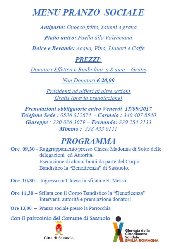 Avis Comunale di Sassuolo organizza la festa del donatore domenica 17 settembre. Prenotazioni entro venerdì 15. Info 0536812674