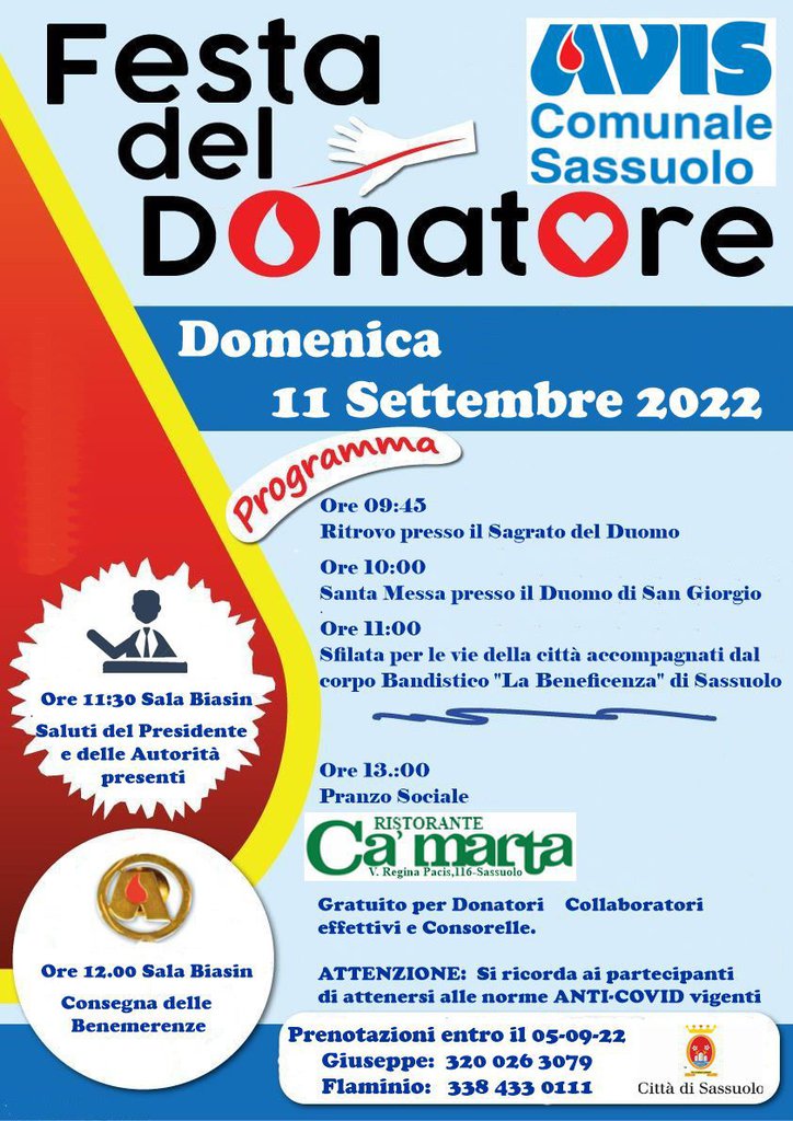 Avis Sassuolo festeggia i suoi donatori con la consegna delle benemerenze e il pranzo sociale. Prenotazioni entro il 5 settembre.