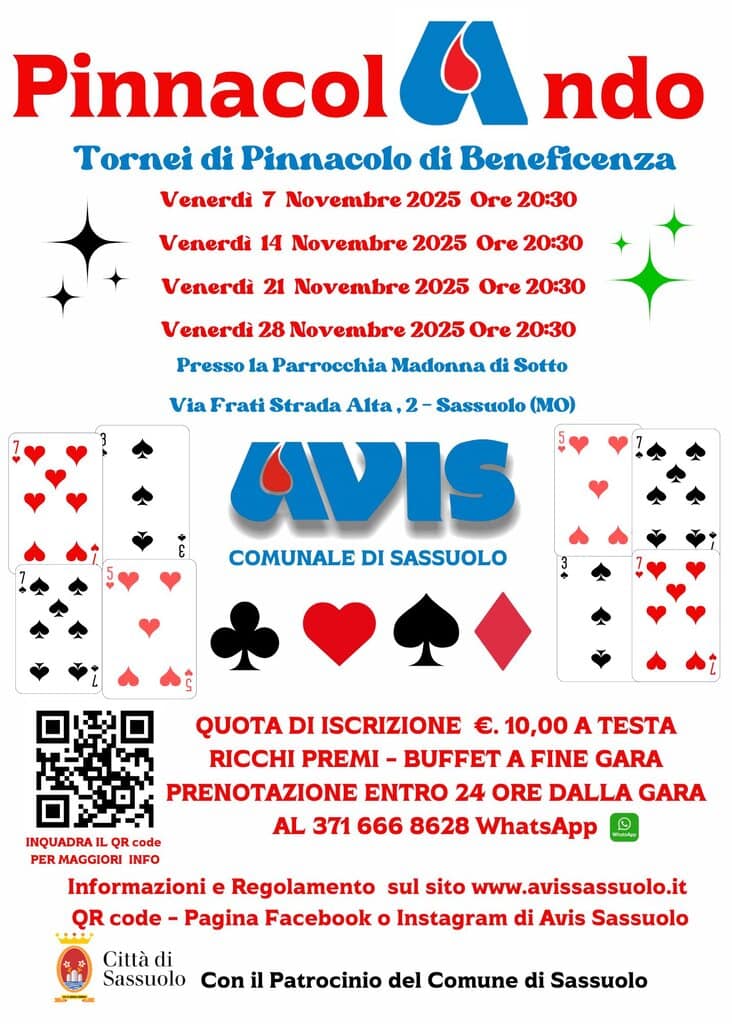 Avis Comunale di Sassuolo organizza quattro serate di Tornei di Pinnacolo di beneficenza. Oltre alla premiazione alle migliori coppie, verranno assegnati altri premi di consolazione ed a tutti i partecipanti verrà offerto un piccolo buffet a fine serata.