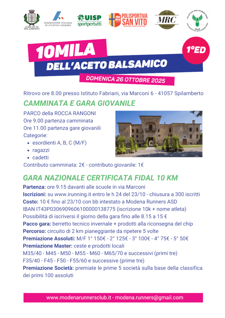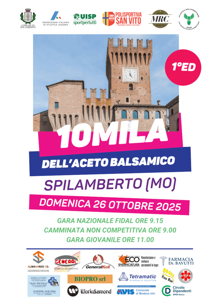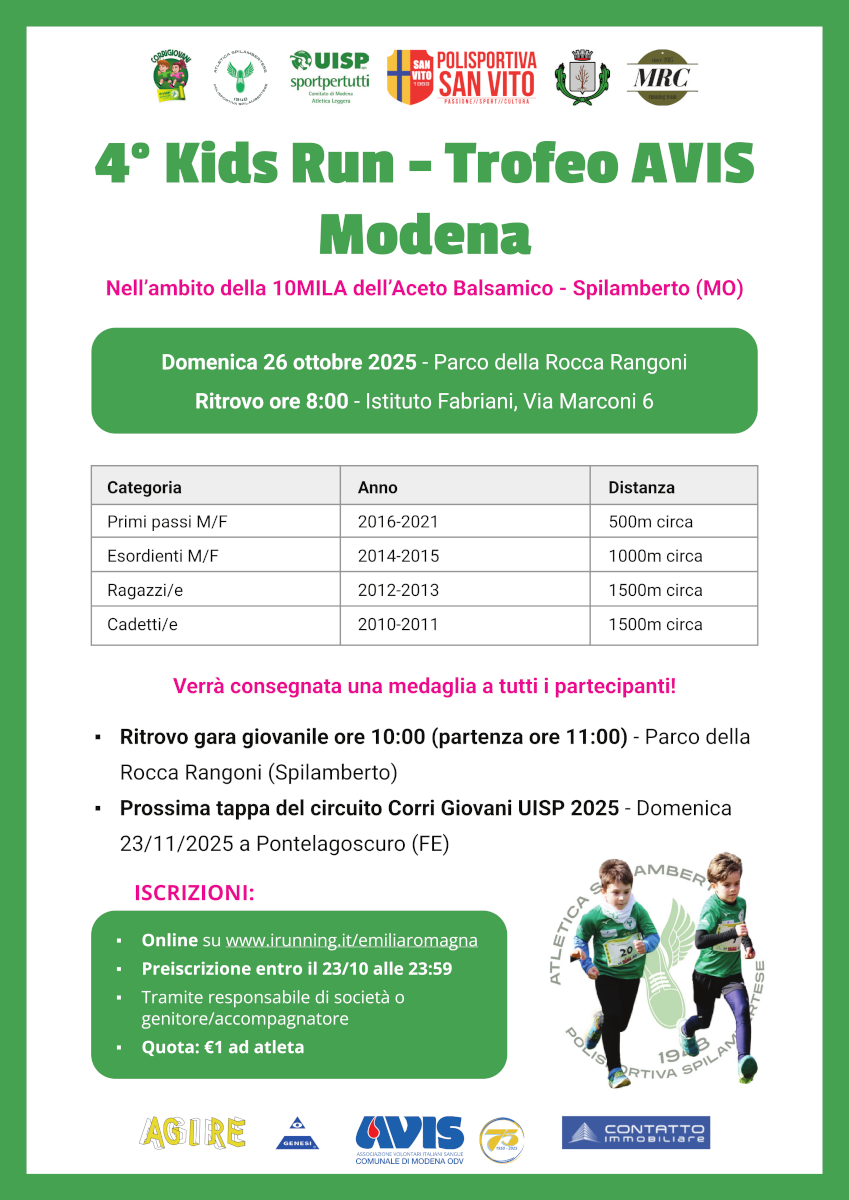 Avis Comunale di Modena organizza la 4° Kids run nell’ambito della podistica “10mila dell’aceto balsamico” nella suggestiva Spilamberto. Sono previste anche una podistica non competitiva, una gara nazionale e gare giovanili. Preiscrizione trofeo Avis entro il 23/10 su irunning.it. Altre info su modenarunners.it